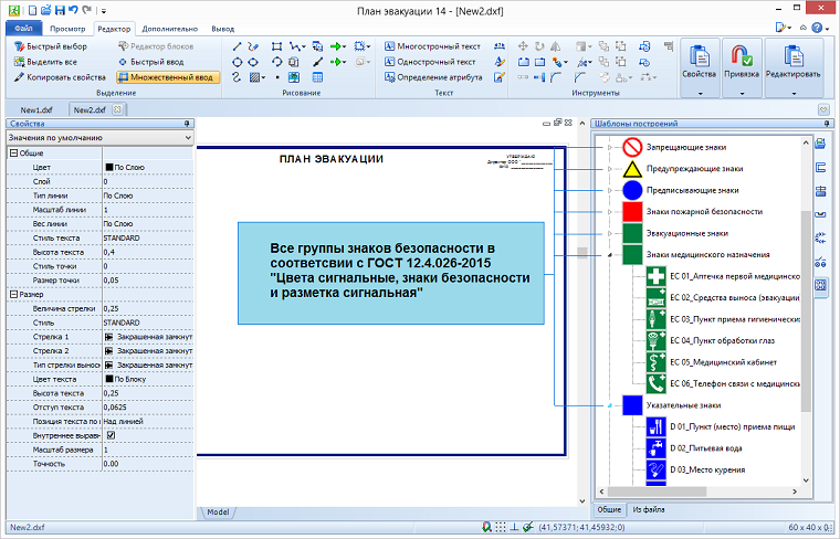 При оформлении плана эвакуации нет необходимости дополнительно загружать библиотеки с нужными знаками безопасности. Перечень знаков безопасности, соответствующий ГОСТ 12.4.026 – 2015, доступен сразу после установки программы.