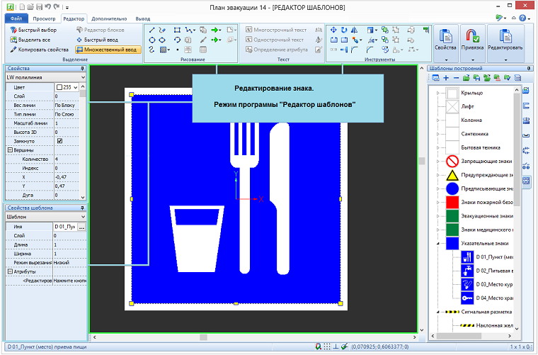 Пользователь может корректировать имеющиеся или создавать собственные знаки непосредственно в программе План Эвакуации, используя для этого специальный режим «Редактор шаблонов». В режиме «Редактор шаблонов» при редактировании знаков безопасности доступны все стандартные объекты (линия, окружность, штриховка и др.) и инструменты редактирования.
