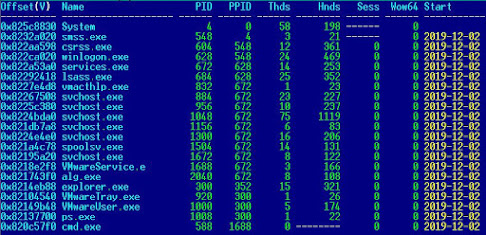 Offset(V) Name PID PPID Thds Hnds Sess Wow64 Star