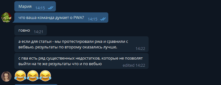 «По результатам теста мы пришли к выводу, что PWA — это не то, на чем стоит останавливаться. При сравнении с аналогичным трафиком на прилки они проигрывали, поэтому мы и решили перевести трафик».