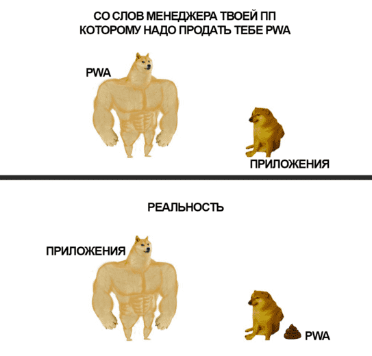 P.s. Ну, и если я так и не смог переубедить. То, вот вам риторический вопрос на подумать. Почему все топовые команды на 50+ человек тратят огромные деньги на внутреннюю разработку, ведь PWA — это так эффективно? Подсказка: бизнес же всегда стремится к эффективности и максимизации прибыли.