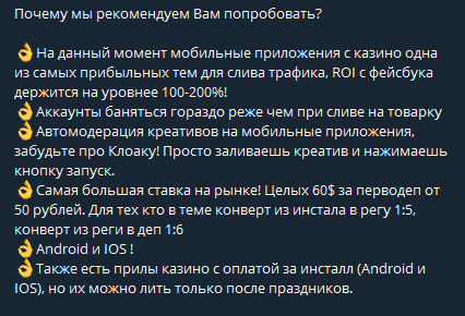 - Простота. На сегодняшний день, вы просто получаете нейминг, диплинк и приложение у менеджера ПП (а частенько даже через бота) и льете трафик, не занимаясь никакой технической частью.