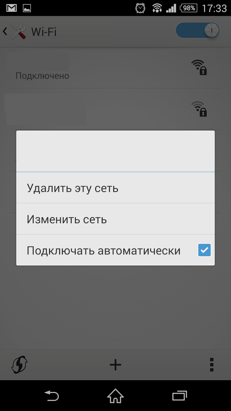 3. Включаем переключатель в самой верхней строчке, далее внимательно смотрим, не подключился ли смартфон автоматически к какой-либо сети (статус «Подключено»), если подключился — долгое нажатие на название сети и в меню снимаем галочку «Подключаться автоматически» (после передачи файлов, можете её снова поставить). После этого отключаем Wi-Fi и включаем снова переключателем в верхней строке. Проделываем процедуру на обоих смартфонах.