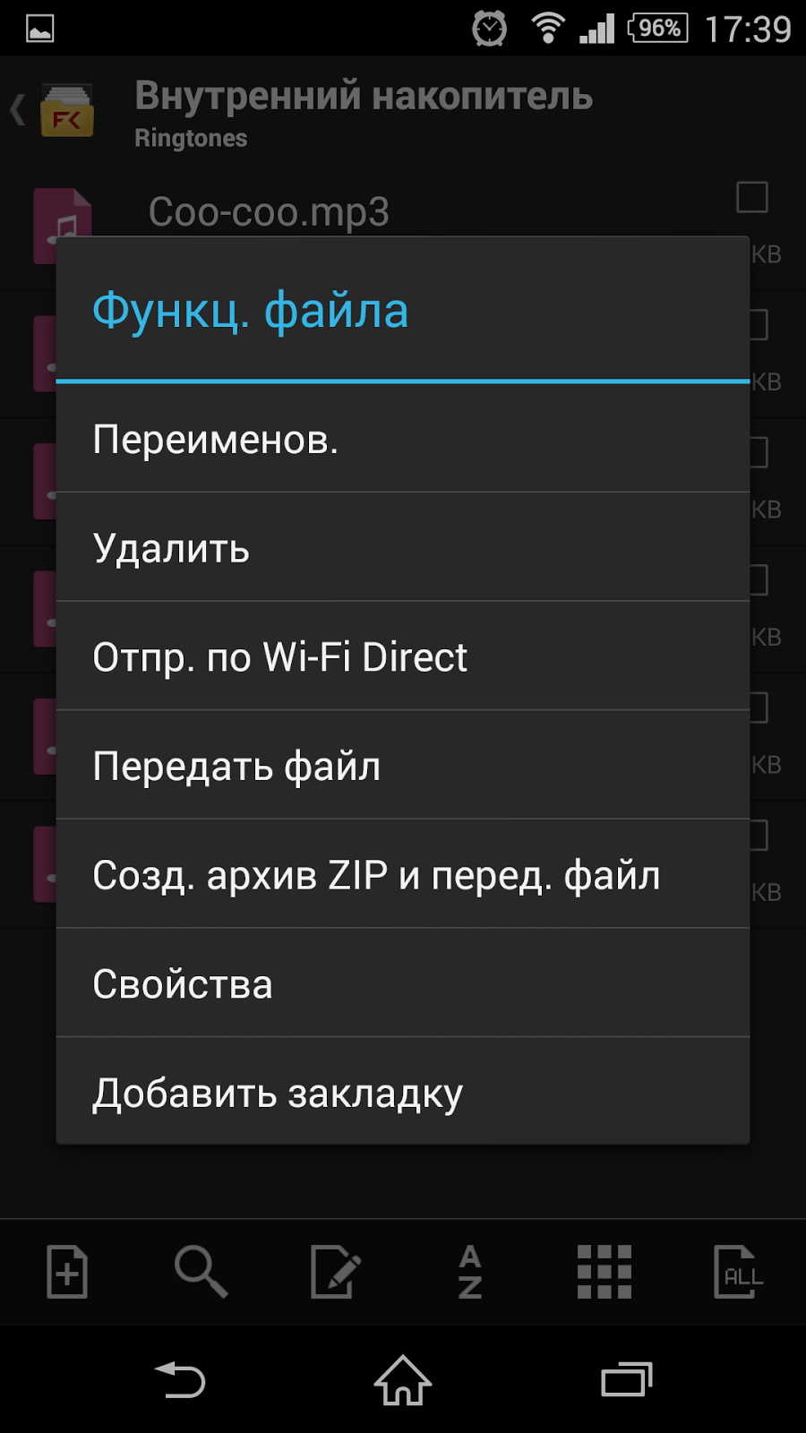 7. Заходим в File Commander или любой аналогичный файл менеджер с поддержкой технологии, выделяем файлы, которые нужно отправить и с помощью долгого нажатия на любом из выделенных файлов входим в меню. Выбираем пункт «Отправить по Wi-Fi Direct».