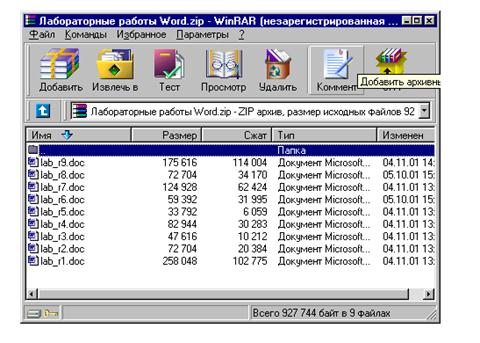 Запускается WinRAR любым из возможных способов, предусмотренных в Windows. Если ярлыка WinRAR нет на Рабочем столе или панели быстрого запуска, то проще всего запустить WinRAR из Главного меню (Пуск –– Программы –– WinRAR –– WinRAR). Рассмотрим основные операции с архивами, выполняемые с помощью программы WinRAR (рис. 13.1).