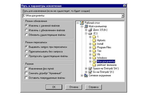 При этом разархивированные файлы попадают в ту же папку, в которой расположен архив. Если требуется извлечь файлы не в текущую папку, а в какую-либо другую, необходимо щелкнуть по кнопке Извлечь в… на панели инструментов либо нажать клавиши Alt+A. После этого в диалоге Путь и параметры извлечения (рис. 13.2) необходимо указать целевую папку и щелкнуть по кнопке ОК.