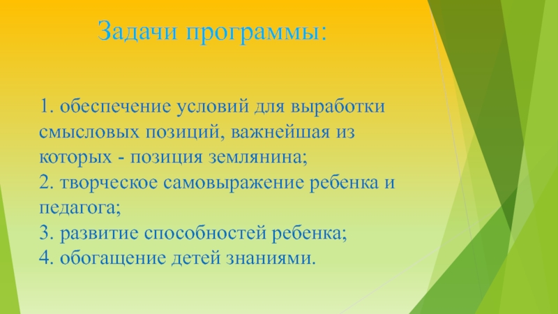 Цель программыРазвитие в детях элементов экологического сознания, она демонстрирует всеобщую взаимосвязь природы, человека и его деятельности.