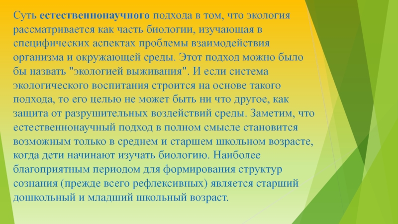 изучающая в специфических аспектах проблемы взаимодействия организма и окружающей среды. Этот подход можно было бы назвать «экологией выживания». И если система экологического воспитания строится на основе такого подхода, то его целью не может быть ни что другое, как защита от разрушительных воздействий среды. Заметим, что естественнонаучный подход в полном смысле становится возможным только в среднем и старшем школьном возрасте, когда дети начинают изучать биологию. Наиболее благоприятным периодом для формирования структур сознания (прежде всего рефлексивных) является старший дошкольный и младший школьный возраст.